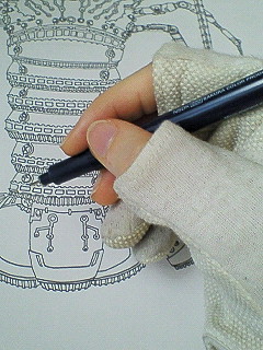 制作のときには必ず手袋をつけています。この手袋は3本指先が空いているのでペンが持ちやすく、気に入ってます。もう2、3年程使っています。もはや制作の友です。